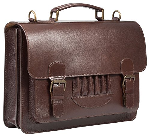 This case is made from a dark conker brown / chestnut brown colour thick saddle leather. The process that was followed in making (tanning) the leather is an ancient technique where vegetable extracts from bark of trees such as oak are used to tan the leather. The bag is constructed using heavy duty synthetic thread. All the materials used are heavy duty industrial grade to ensure this bag lasts a long time. This leather and case will age very well and the more it is used, the better it will look. The leather has a very natural finish and does not have several coats of paint to hide any natural characteristics of the leather which is typical of cheaper leather bags. The leather used in this case shows any natural markings of the skin and this adds to the beauty and uniqueness of each bag - 16" (W) x 12" (H) x 5" (D). Fittings are antique Brass. - The front of the bag opens with two auto snap antique brass buckles to reveal a large open pocket. To the front of this open pocket are six pen holders - The case has two compartments, separated by a zipper pocket divider. The first compartment has a mobile phone pocket, a pen holder and a card holder. The second compartment has ample storage space - The second compartment has a 12 inch side zipper pocket. The bag is lined. There is a removable extandable shoulder strap with an overlay and an expandable laptop pouch. The bag is unlined